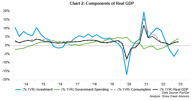 Diving into the components of GDP (Chart 2), we believe the recession has been delayed, not avoided. Consumer and Government spending was remarkably strong in the first half of the year, while investment has detracted from growth since 2022.